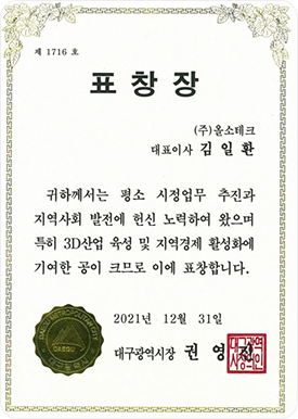 대구광역시장 표창장